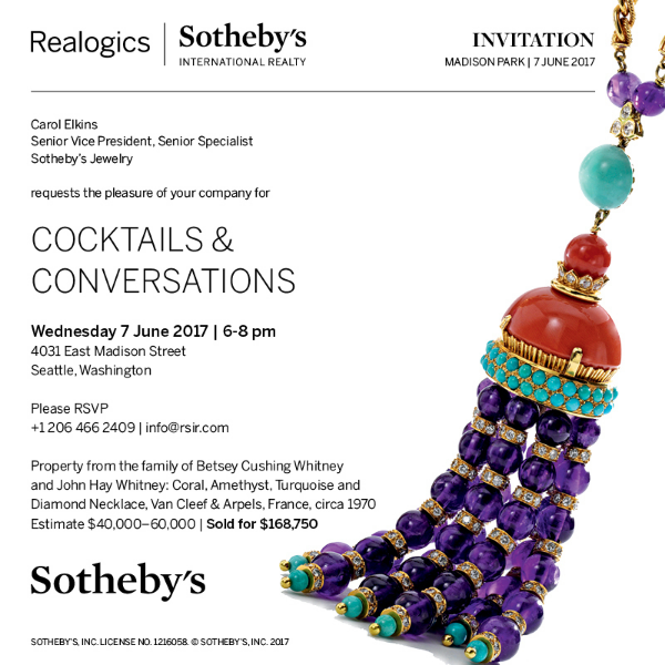 On Wednesday June 7th, Carol Elkins, Senior Vice President, Senior Specialist Sotheby’s Jewelry will join us at Park House for Cocktails & Conversations. As the Sotheby’s Auction House website describes, Elkins “is regarded by dealers and collectors as a leading specialist in antique and period Jewellery” and her current role at the Auction House involves “organising, curating and promoting the New York Jewellery sales and meeting clients to provide auction estimates, and estate and fair market appraisals.” Elkins will offer a brief educational presentation discussing her experience and various pieces, which will be followed by a reception where guests will grab a drink, mingle and ask questions.